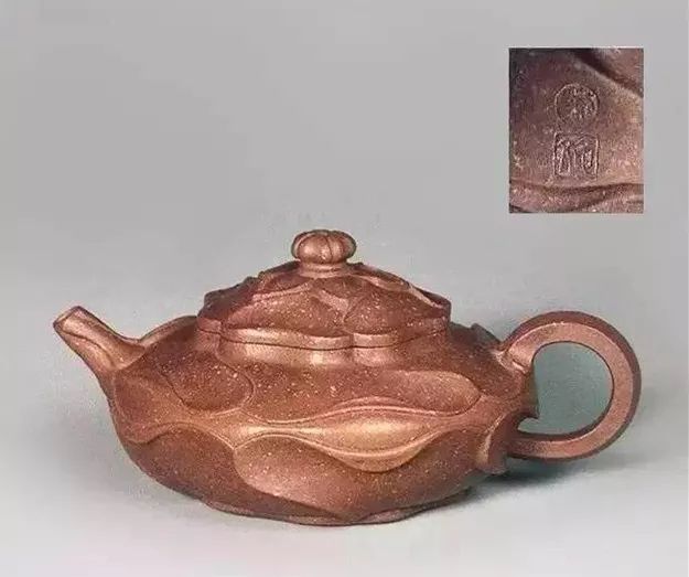 流直把环,通体以秋葵花为式,花瓣参差,向背分明,如笑如语。许氏巧手,制壶无一不竭尽智力,而兹壶精制尤穷神妙,非他工之可拟论。