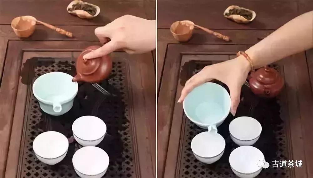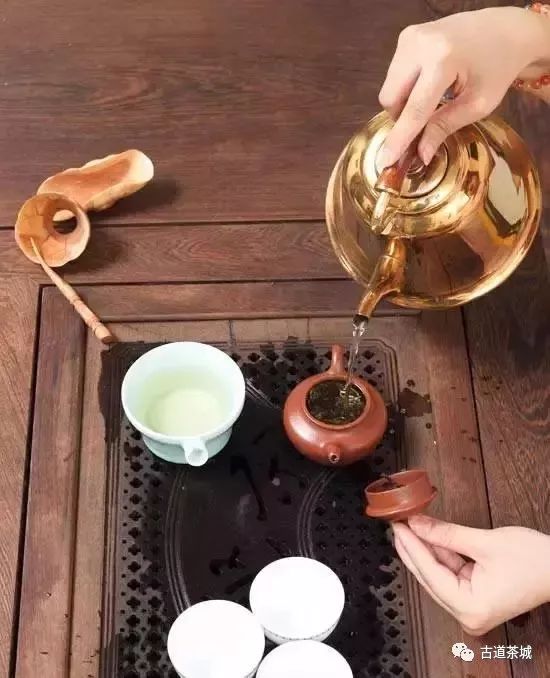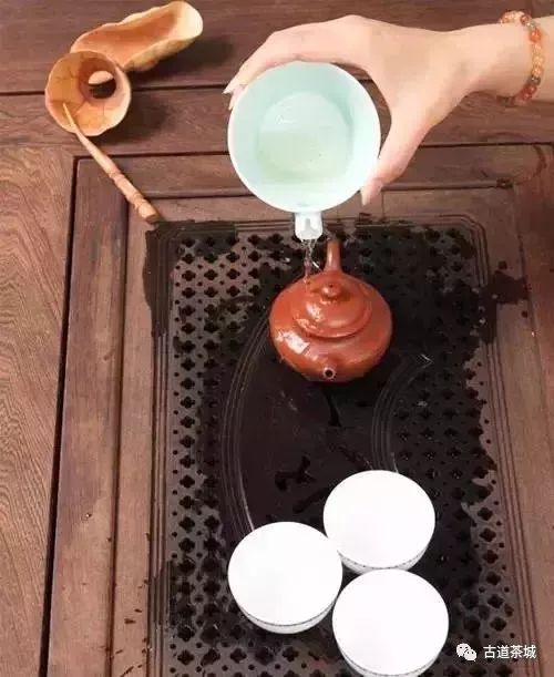 把沸水再次倒入壶中,倒水过程中壶嘴「点头」三次,别一次把壶倒满,茶道的其它程序大部分也只是好看而已,只有这步才是平时大家常用的。