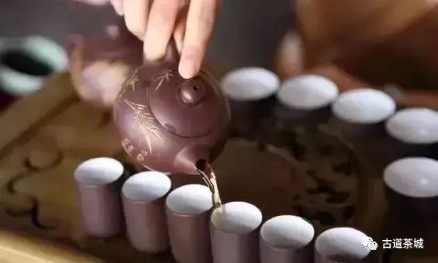 轻轻将壶中茶水倒入公道杯,使每个人都能品到色、香、味一致的茶。给人精神上的享受和感官上的刺激,简单点说就是给客人每人一杯茶。