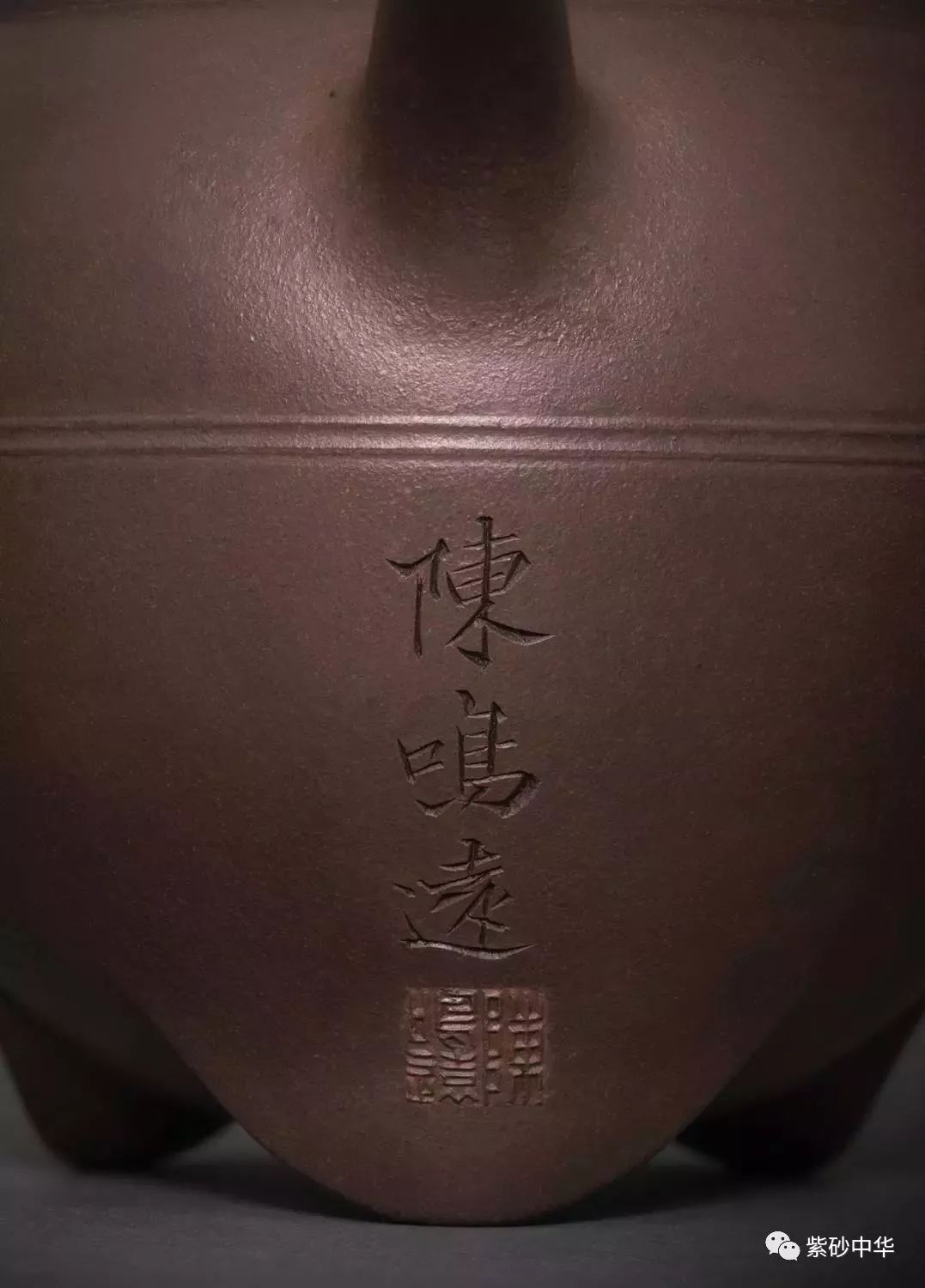 壶造型圆润,呈球形,自上向下渐敛,底部顺势塑出三足,线条柔和自然,短流圈耳,直口弧盖色呈朱红,包浆浑厚古雅,壶身腹部一周起弦纹两道,于沉稳中又平添灵动。流部下方阴刻“陈鸣远”楷书款识及篆书阳文方章,字体遒劲潇洒,颇见功力。