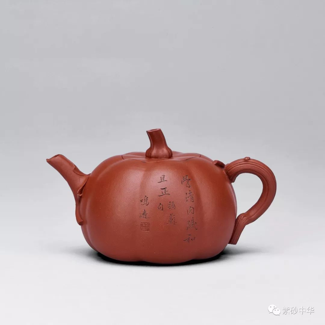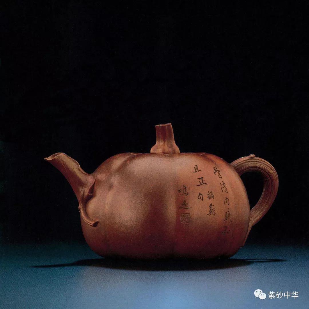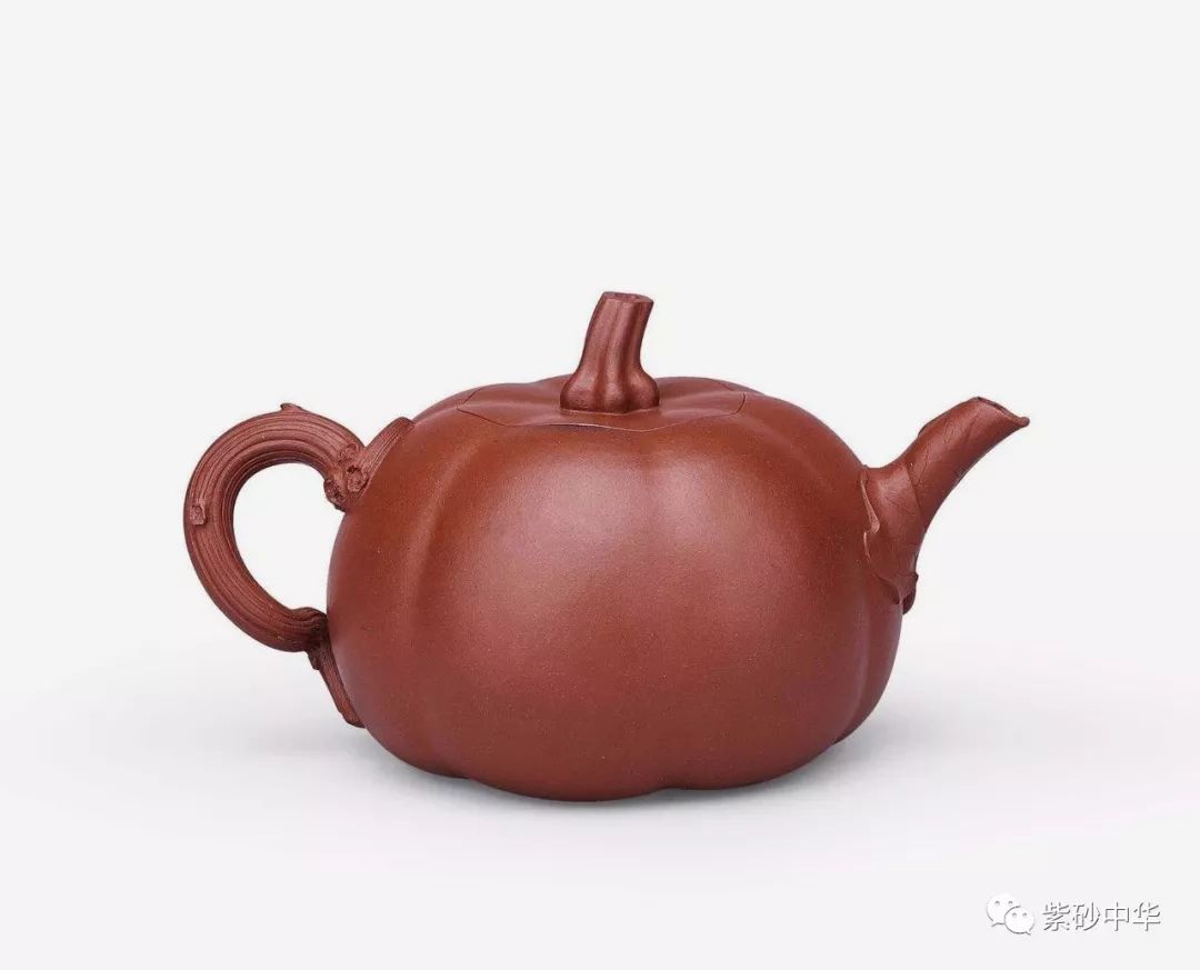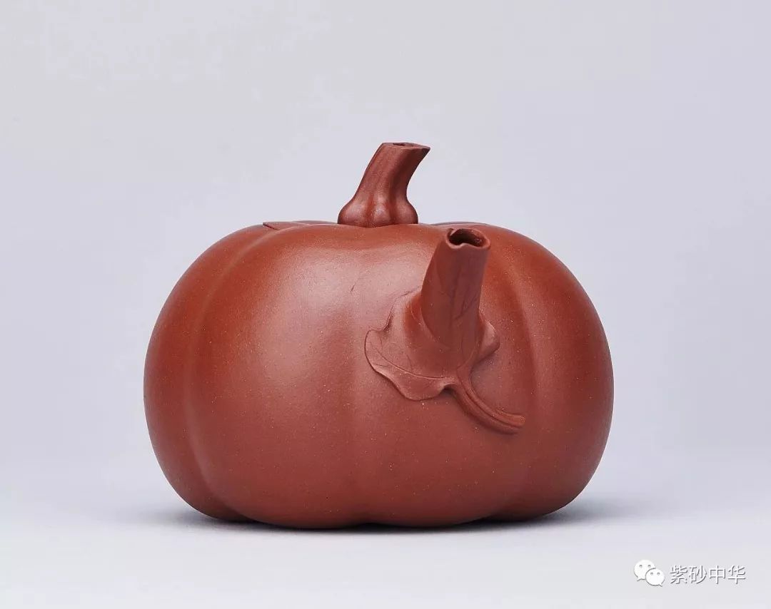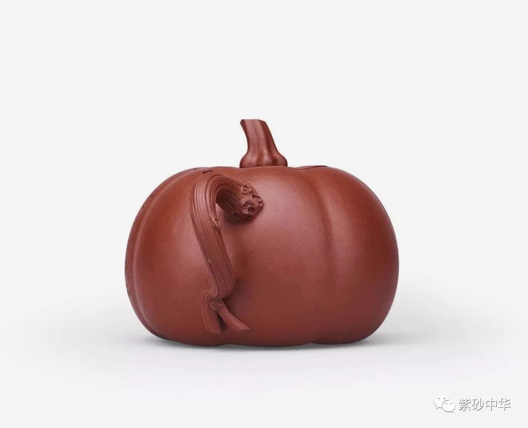 壶作七棱腹,卷叶成流,流口一任自然,瓜藤作壶柄,蜿蜒灵动,瓜梗作盖钮,挖中空而显秀巧,南瓜造型活灵活现,浑然天成。