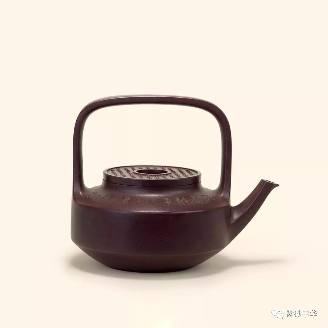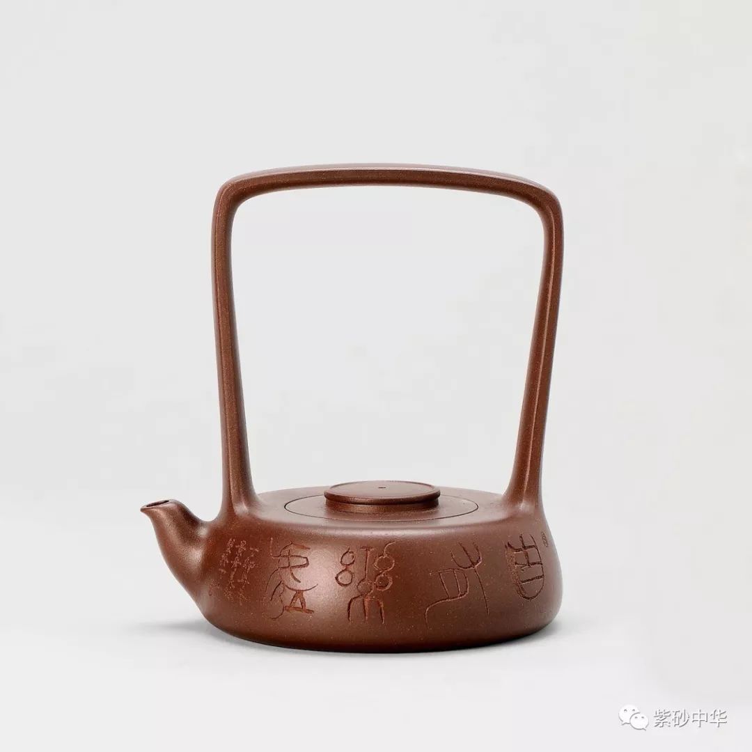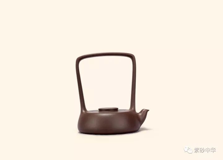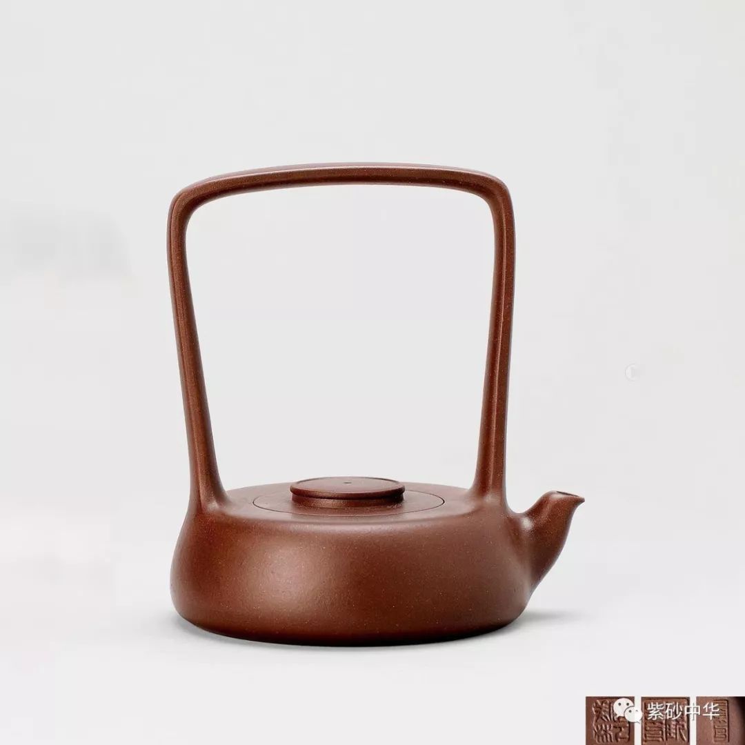 壶身扁圆似鼓,上部内收,嵌盖、扁圆钮与短弯流相呼应。提梁顺壶身肩部向上渐开,顶部与壶底匀称辉映,结构严谨。超高的提梁和均扁的壶身完美协调,虚实处理得恰到好处,线面简洁光素,大美无言。