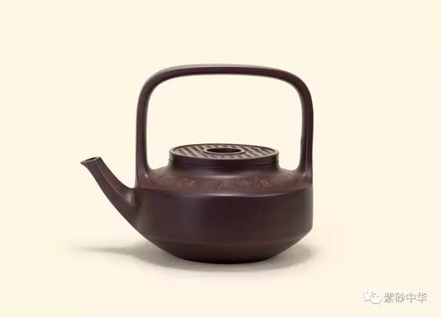 此壶为顾景舟先生取其代表作“提璧壶”之造型,历经长期反复推敲,创作而成。在盖面处作较大改动,作玉璧状,故称之为“玉璧提梁壶”。