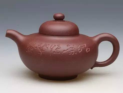 “君德式”乃因明季壶工张君德而名。呈鼓腹矮梨形,三弯流朝天,圆环把,截盖圆珠钮,捺底,底款以行书刻满篇“诫子书”。此壶以细密青灰砂制成,胎薄均匀,制作精巧,刻款流畅,窑烧火候得宜,手感顺滑,十分讨喜。晚清时期,东瀛煎茶道盛行,外销日本的紫砂茗壶类颇为畅销,但满刻名篇文章之甚为少见。