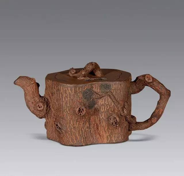 泥色呈古老苍松树皮质感,造型以松段一截做壶身,结构极严谨,比例合理协调,整体气势古朴。树皮斑驳苍劲,松枝虬蟠其上,针叶写形亦写意,形意俱佳。壶嘴与把手均以老松枝塑成,质朴古雅,挺秀有神,形象逼真;壶盖为嵌入式,口盖紧密无间,盖呈不规则形,有年轮效果。