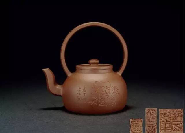 粗看很不起眼!大彬提梁身筒成较大且丰满的扁球形,上部圆环状提梁粗大,六方三弯嘴,六瓣平扣钮,压盖,圈底,溜肩,素身。再看耐人寻味!身筒以实托虚,圆环以虚带实,上下两个圆弧构成的虚实对照,达到了视觉上的微妙平衡,整体上让人感觉气势雄健,浑然一体。所谓“周接四海之表,浮于元气之上”。三看惊为天物!大彬提梁如佛趺坐,清风朗朗。