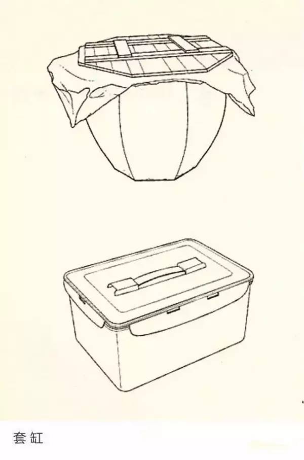 套缸:用于放置紫砂坯体半成品的粗陶缸,上面覆薄膜(先前无薄膜时用湿布)和缸盖,以保持缸体内的湿度,防止坯体风干,便于后期继续制作。现今多用塑料便携箱代替。