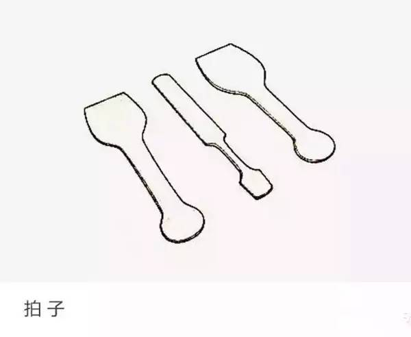 拍子:用来拍打身筒、拍片子、推墙刮底的木制用具。古称“掌”,“一薄一厚,分听土力”,根据泥料的特性,拍子有大有小,质地以不易变形的硬木为主。拍子是紫砂工艺的基础工具,通常打身筒的拍子起码要有三把,大、中、小各一把。