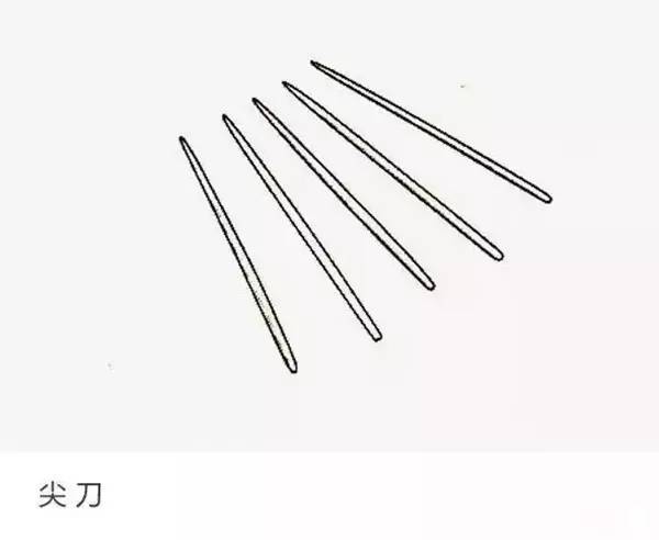 尖刀:紫砂成型过程中进行切、削、挑、挖、刮等动作的刀具,通常用来雕琢嘴部、钮部或复滋泥等用途。古称“鑐”,其形状及作用为“长视笔,阔视薤,次减者二,廉首齐尾,亷用割,用剃,用剔;齐用抑,用趁,用抚,用推,凡接纹深浅,位置高下,齐亷并用,壶事此独勤。”鑐,是锁中的簧片,这里形容很薄的刀片,尖刀长如毛笔,阔如韭叶,一头锋利、一头平正,锋利的一面可以割、剃、剔,平正的一面可以压、抚、推坯体。是镶接、塑型的主要工具。用旧了的鳑鲏刀通常不会丢掉,可以改良成尖刀继续使用。尖刀的种类形制较多,有铁尖刀、竹尖刀、通嘴尖刀、弯尖刀等。