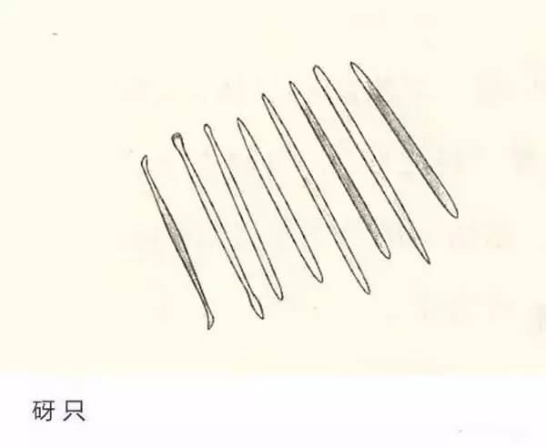 砑只:雕琢器皿细节的工具。平面微凸,边缘呈一定的小弧度,用来修饰器型细部的转折部分。