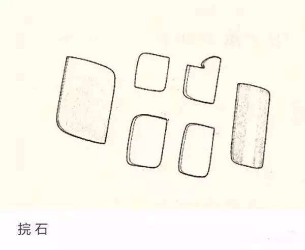捖石:是一种转角略带弧度的小方片,一般“用石如碓,为荔核形”,通常用来加工底和盖内部的滋泥填充后的死角,使内壁光洁圆润。用竹、紫砂、塑料凳材质制成,分捖盖石和捖底石两种制式。