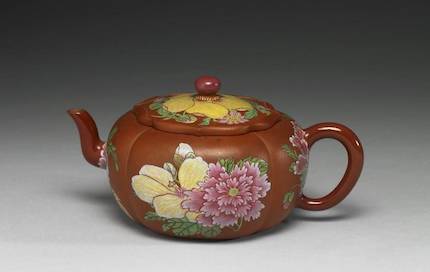 纹识描述: 壶身呈四瓣瓜棱壶身,圆口,曲把,短流,盖边作四瓣莲瓣形捲唇、带圆形纽,纽顶一通气圆孔。盖面绘秋葵及蓝菊,卷唇盖沿或伤缺后涂饰嫩绿色;壶外壁两面棱区画桃实,桃花,月季,另二面流把周边则绘折枝月季花。器面全施透明釉,内面则为紫砂素胎。