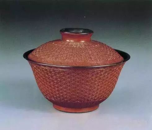 仿雕漆珊瑚红釉银里盖碗
