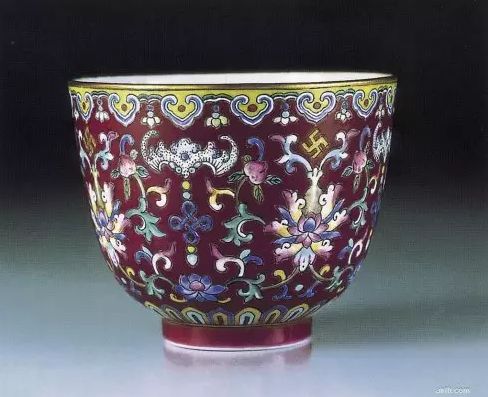 粉彩万福长寿红地茶钟