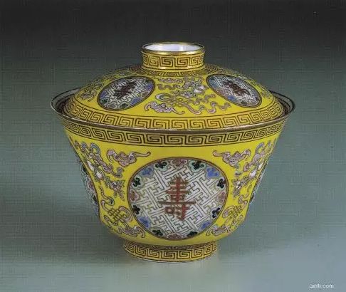 纹识描述:碗内白地上满画粉彩梅花、蝴蝶,器、盖内外口沿及底边、圈足均画回纹一道,碗、盖外壁黄地上四圆形开光万字内各书「万」「寿」「无」「疆」,并围以如意云纹;开光间以蝙蝠、桃实、盘长等纹饰,寓意万寿无疆。盖圈足内及碗底朱红「长春同庆」四字二行楷款。