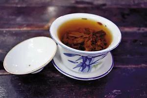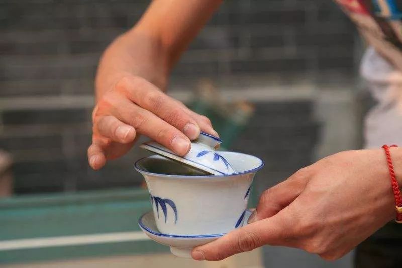 饮茶同样需要平心静气,左手拿起茶碗托盘,右手抓起盖子,轻轻地“刮”几下,其作用是可滗去浮起的茶叶等物,然后将茶盖呈倾斜状,送到嘴边,再把茶汤吸进去,不能有声音,要一口一口地慢慢饮。