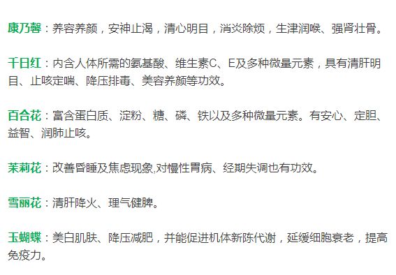 甘菊:明目、退肝火,治疗失眠,降低血压,可增强活力、提神。增强记忆力、降低胆固醇。