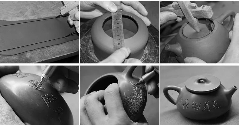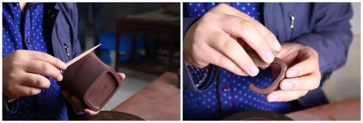 首先做好壶身,经过精修细改之后外表光滑如玉; 精修壶和壶把,别看小部件,实为画龙点睛之笔。