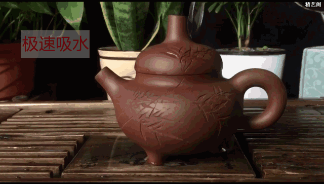 五 、浇水:水浇在真紫砂壶上面,不会形成明显的水珠,水是比较均匀的一片,然后没多久就逐渐被紫砂吸收。这个与紫砂多孔的物理结构有关,紫砂具有2%的吸水性。但是水浇在陶土的假紫砂和瓷器上面,都是明显隆起的水珠滞留,直到最后风干。