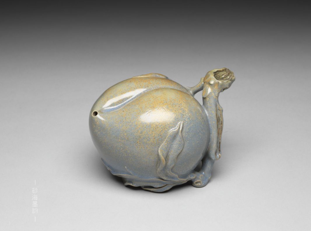 此器状连蒂带枝叶蟠桃,中空,尖端有小孔为流,另端折枝高起处为注口。