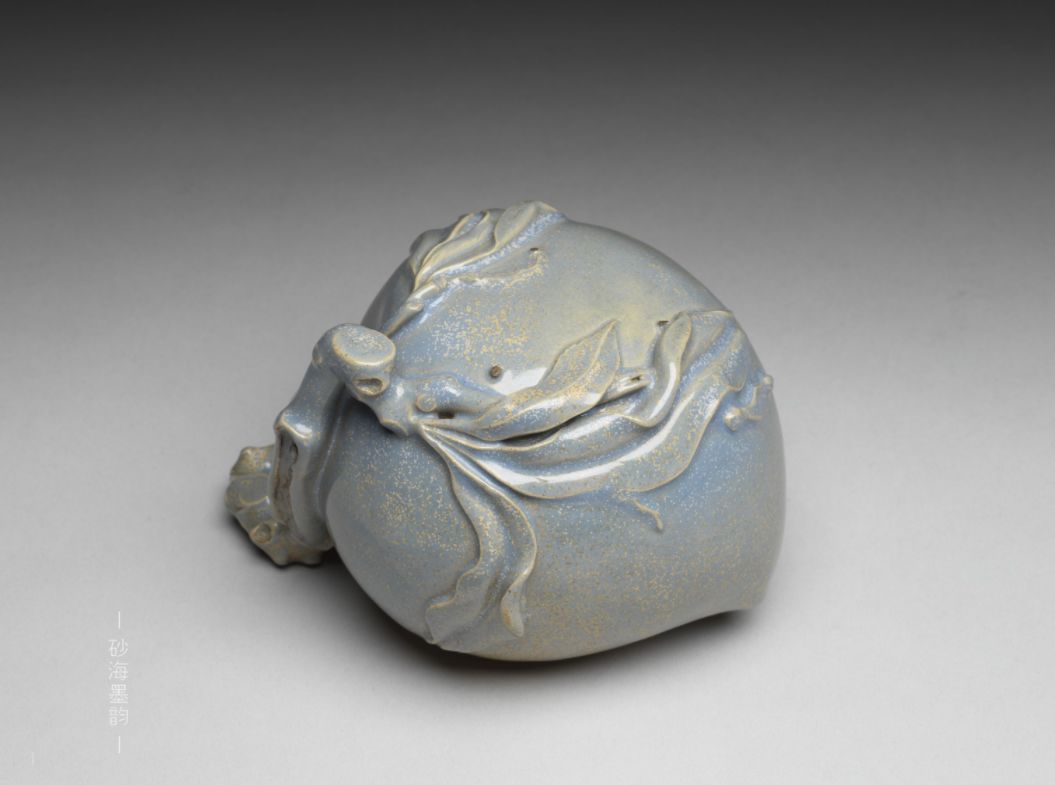 本器塑形生动,所施天蓝釉色属钧釉系统;虽然金华、景德镇、广窑皆盛产仿钧釉色作品,但此件文具似较近于宜兴的制作技法、釉及造形。