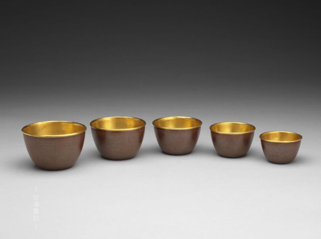 紫砂紫金釉套杯,由五件大至小可依序套合之小杯相叠成套,俗称套杯。以紫砂为胎,外壁施罩紫金釉,杯内于烧成后加镶金属,整体典雅富丽。