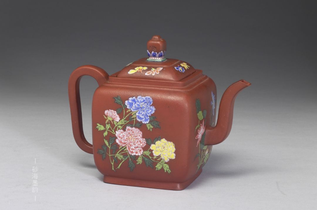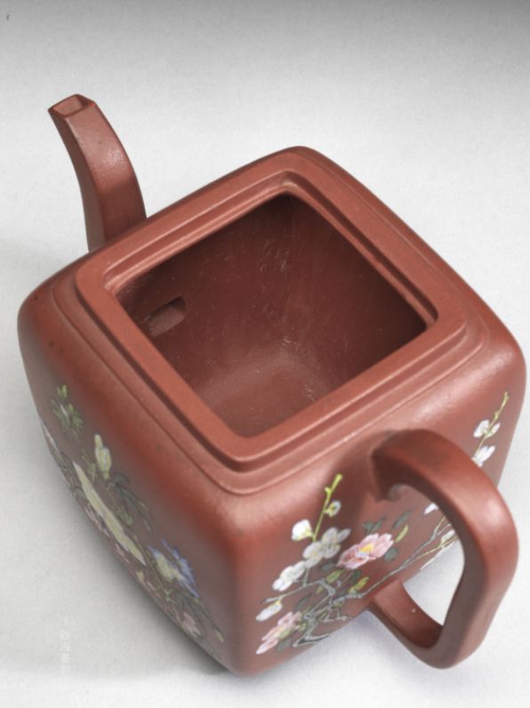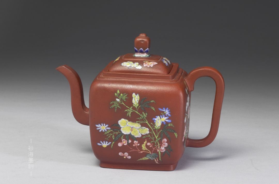 宜兴胎画珐琅五彩四季花卉方壶,壶身周正,壶流、壶钮及壶把亦作四方。壶身、壶盖四面,以珐琅彩绘饰四季花卉,整体炫丽而缤纷。