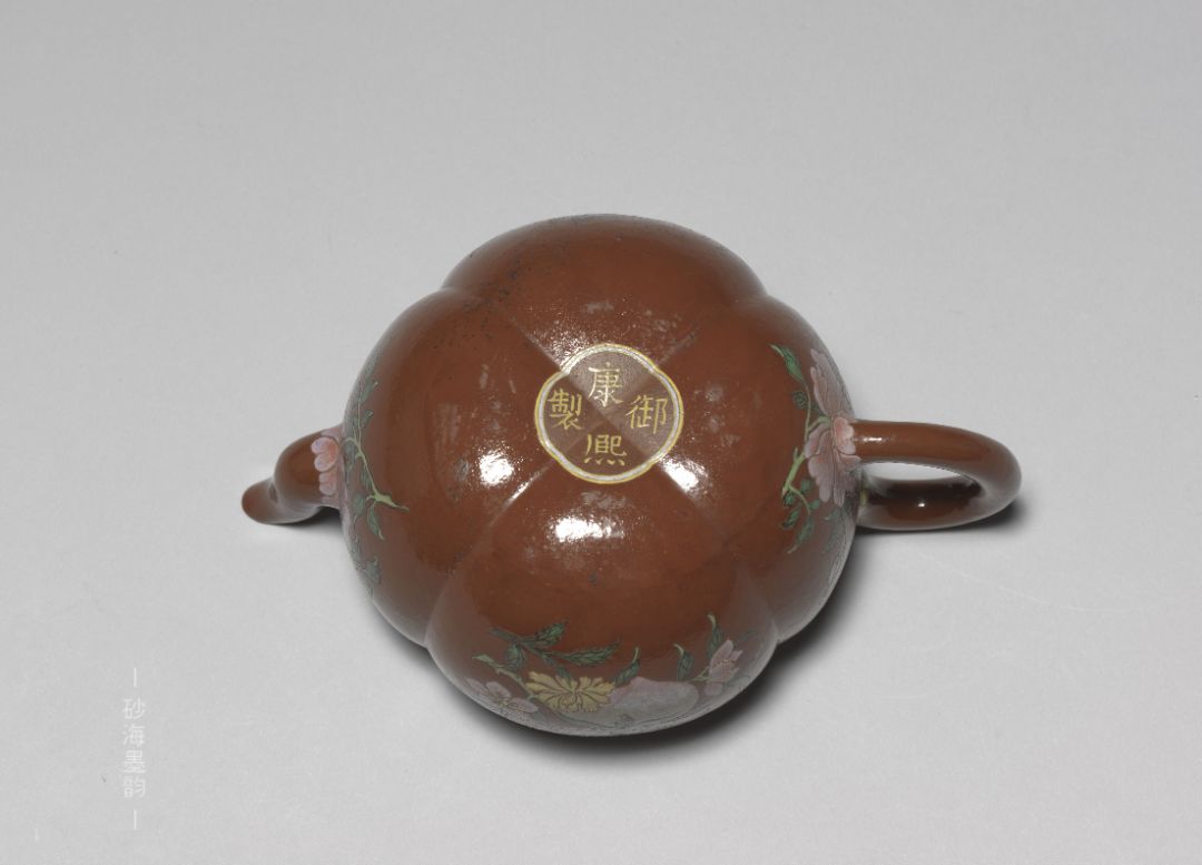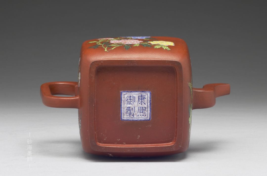 壶底正中先以白色彩料打底,后书「康熙御制」四字蓝料楷书款,或可推测其为康熙皇帝御用的茶器之一。