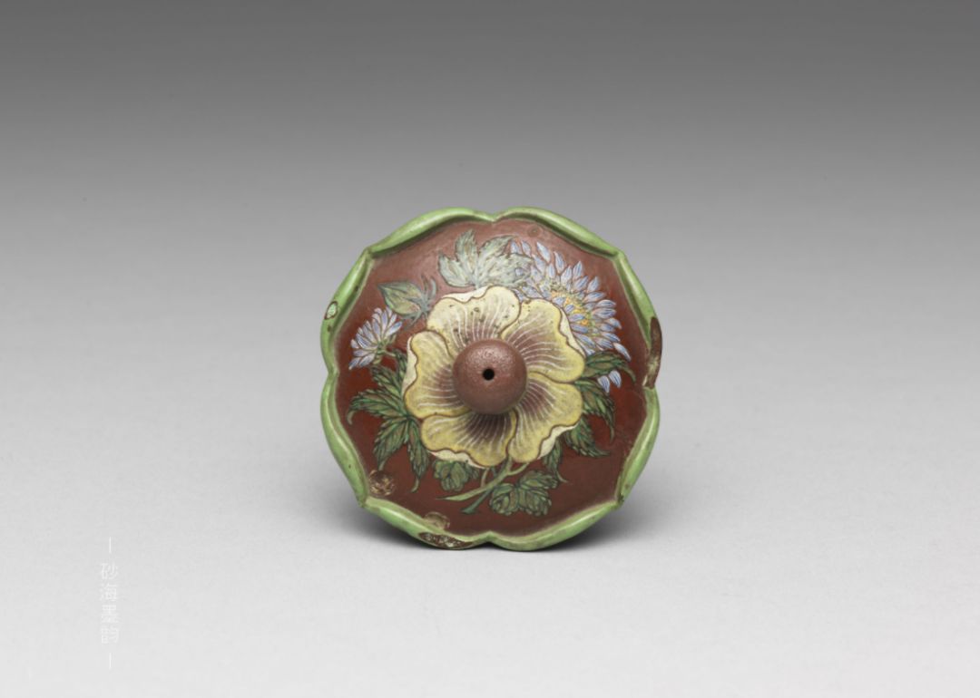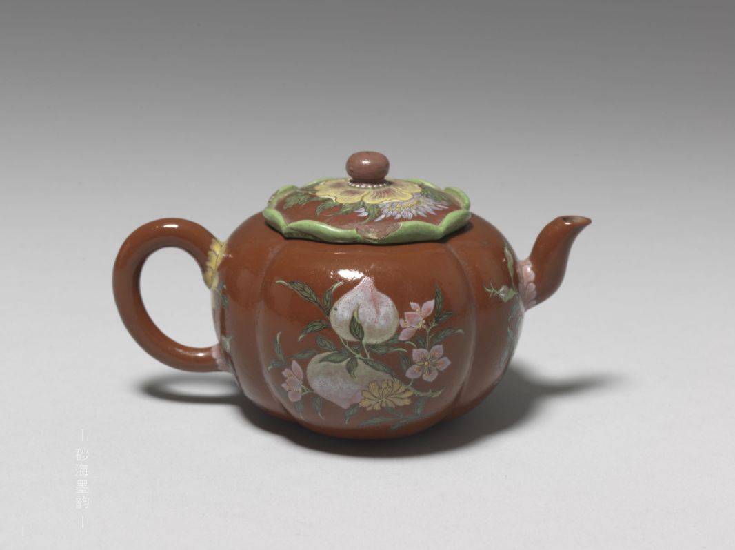 宜兴胎画珐琅万寿长春海棠式壶,以四瓣瓜稜为壶身,以缱绻瓜叶为壶盖,整体颇具像生趣味。