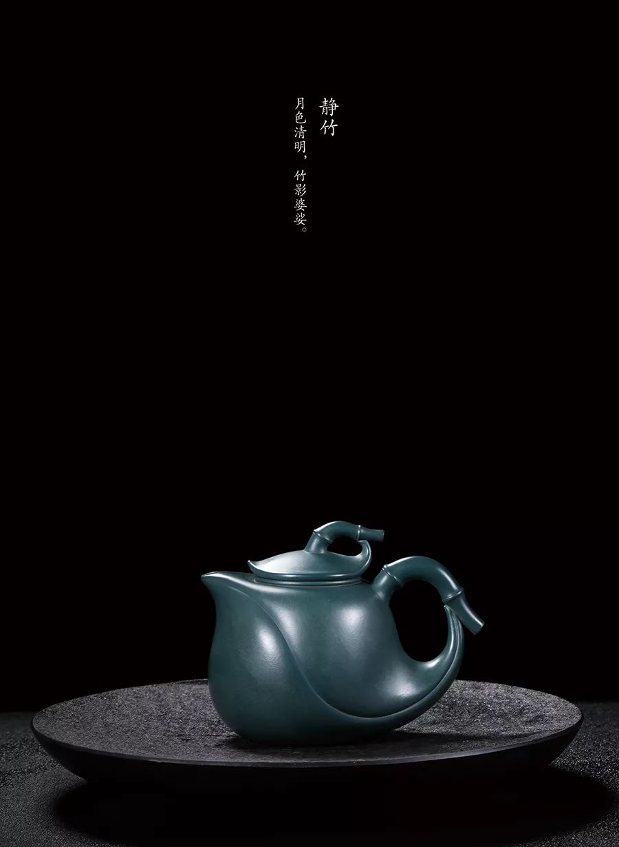 此壶壶身、壶嘴、壶把三位一体,壶嘴上翘,从嘴部一条子午线由上而下,直贯壶把尾部,似一太极图,暗含万物调和之意。壶把与壶钮形制以竹为素材,有美好祝福的意蕴。用此壶品茗,更是“茶禅一味”的最好诠释。