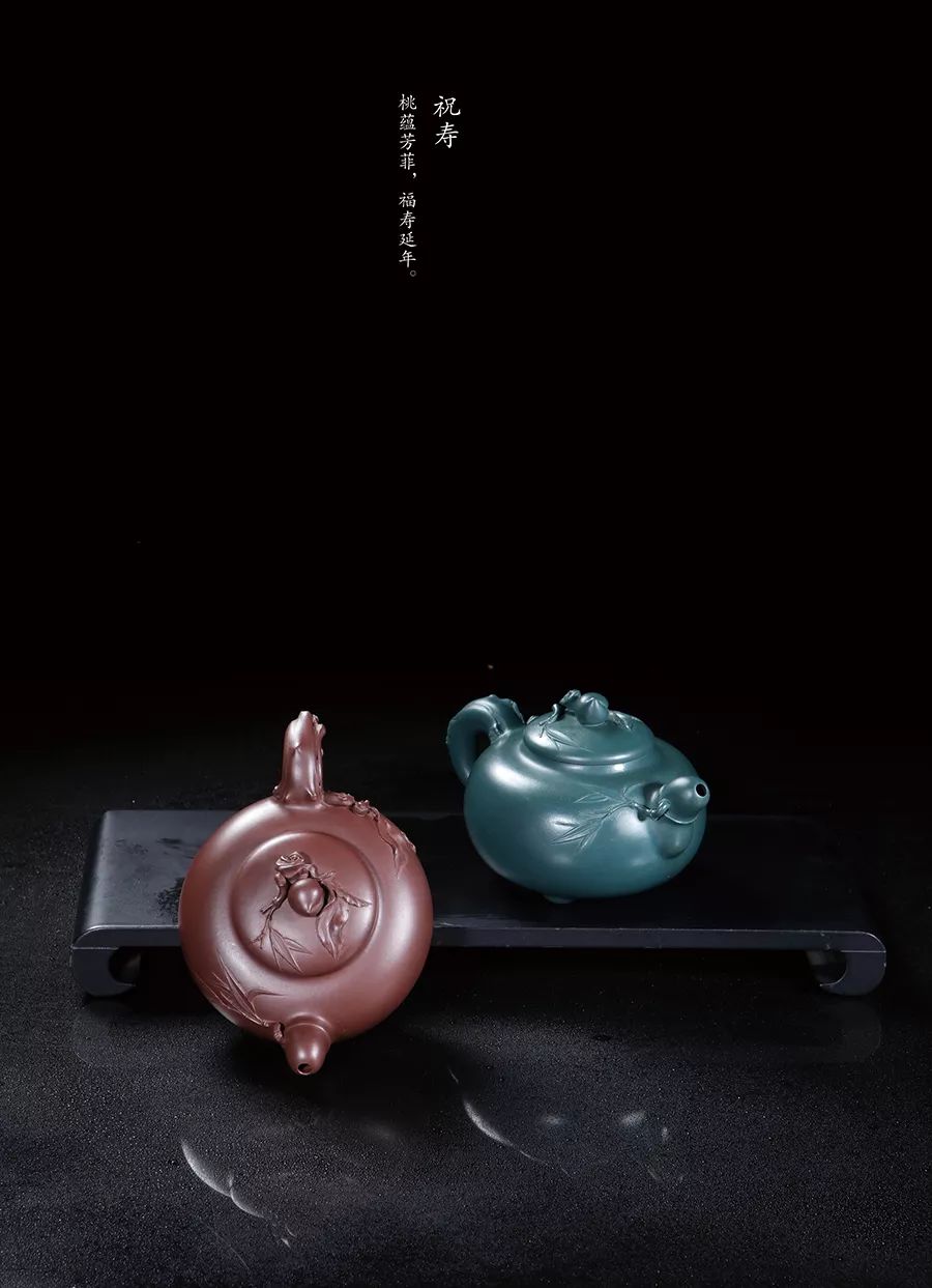 壶身圆润光泽,把和钮以桃枝造型,苍劲干练,壶身叶片制作精细。《祝寿壶》以寿桃为题材,以桃枝、桃叶、小桃子为装饰,使壶看起来别出心裁,趣味盎然。