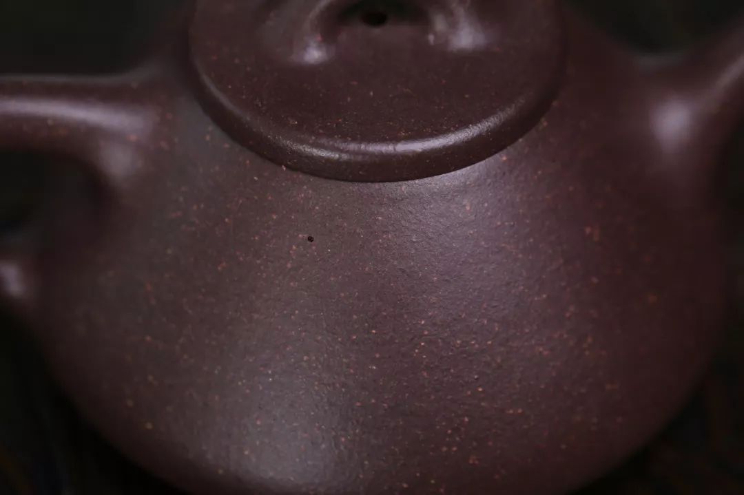 烧成后呈紫红色调,胎质呈现细梨皮状,壶身有金砂显现,砂质细密油润,色泽纯正、沉稳,在高温烧成后,色泽略泛灰,金砂明显,极为惊艳。