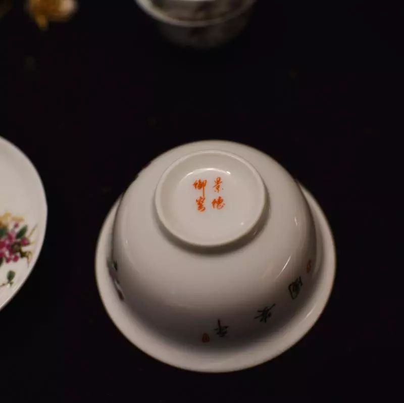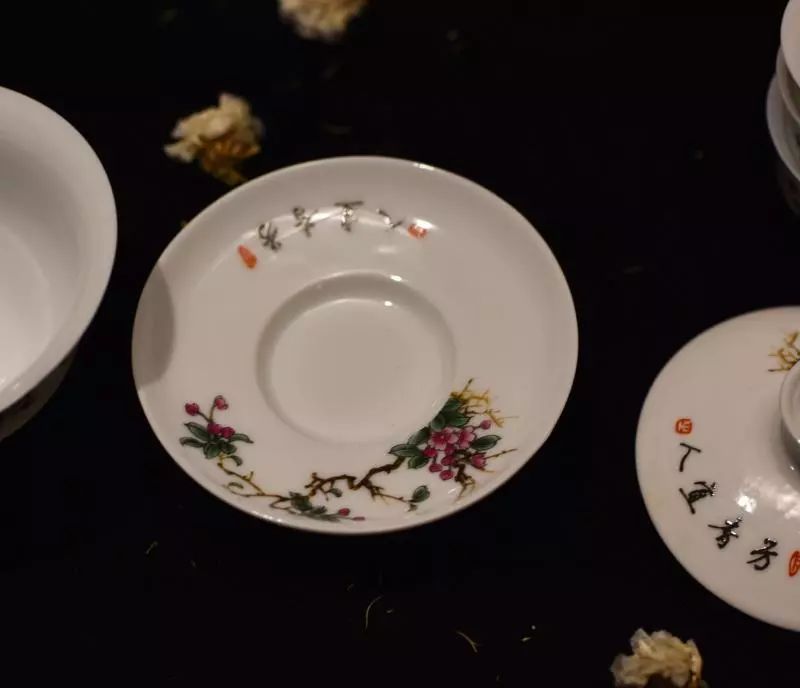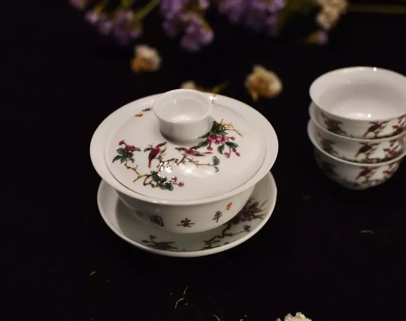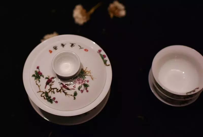 90年代台商订制的盖碗套装,花鸟画工精湛,器型规整。盖碗及小杯撇口边沿皆绘有含苞待放的花枝。