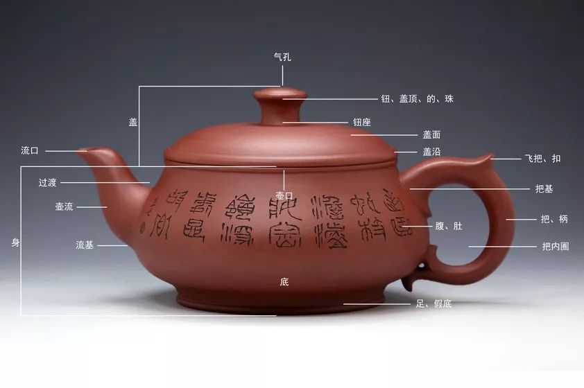即壶身、壶口、壶底、壶足、壶盖、壶钮。