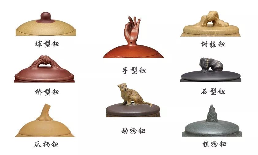 亦称(的子)壶钮为揭取壶盖而设置。钮虽小,但有“画龙点睛”的作用,变化丰富,是茗壶设计的关键部位。常见有球形钮、珠钮、柱形钮、桥梁钮、套环钮、瓜柄形钮、树桩形钮、动物肖形钮。