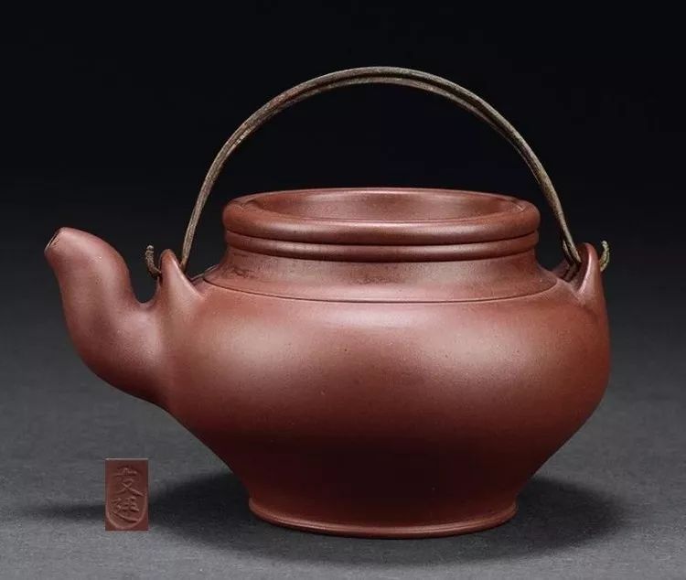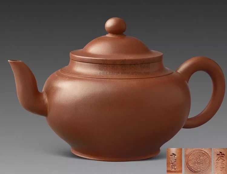 盖内钤“友廷”二字楷书椭圆章。壶嘴三弯,伸展自如,圆腴光润,品茗端拿摩挲,手感触觉舒适。泥色为紫红色,久用光润如古玉,亚光闪亮。底为凹形,铜把作软提,便利提携。