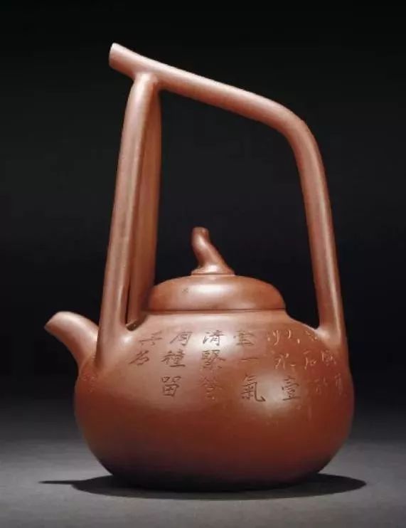 圆形茶壶,提梁式,直流,圆弧盖桥形钮。整件作品古朴简练,清雅温厚,观之悦目。