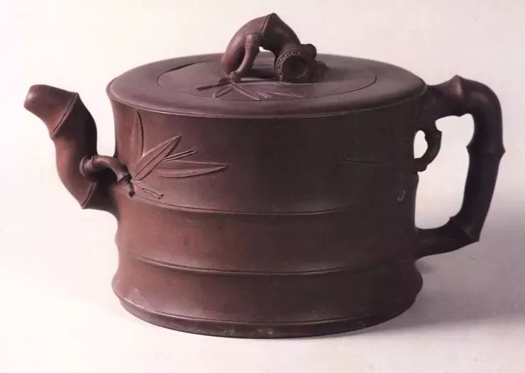 竹段壶呈紫色,沉着稳重,壶体为毛竹段形,嘴、盖、把,均以竹枝、竹叶装饰,比例匀称,疏密合度,工艺精巧,为壶中佳品。