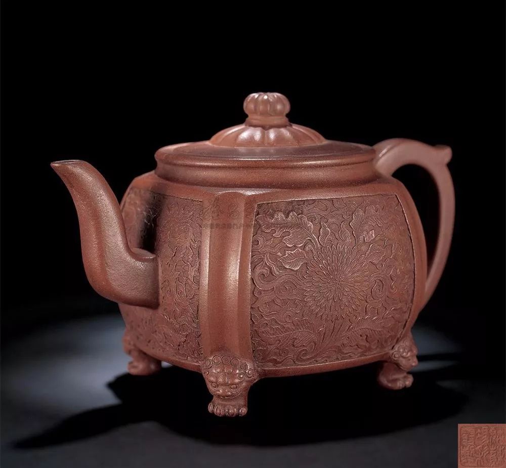 壶方形,倭角,短束颈阔口,腹部中部向外鼓起,四角为四兽首蹄形足。曲流较长,螭龙形把,瓜棱形盖、钮。壶身近方形开光内浅浮雕花卉纹,花瓣盛开,枝叶蔓生。外底有“姑苏冯彩霞制”六字方形印款,款识篆体、阳文。