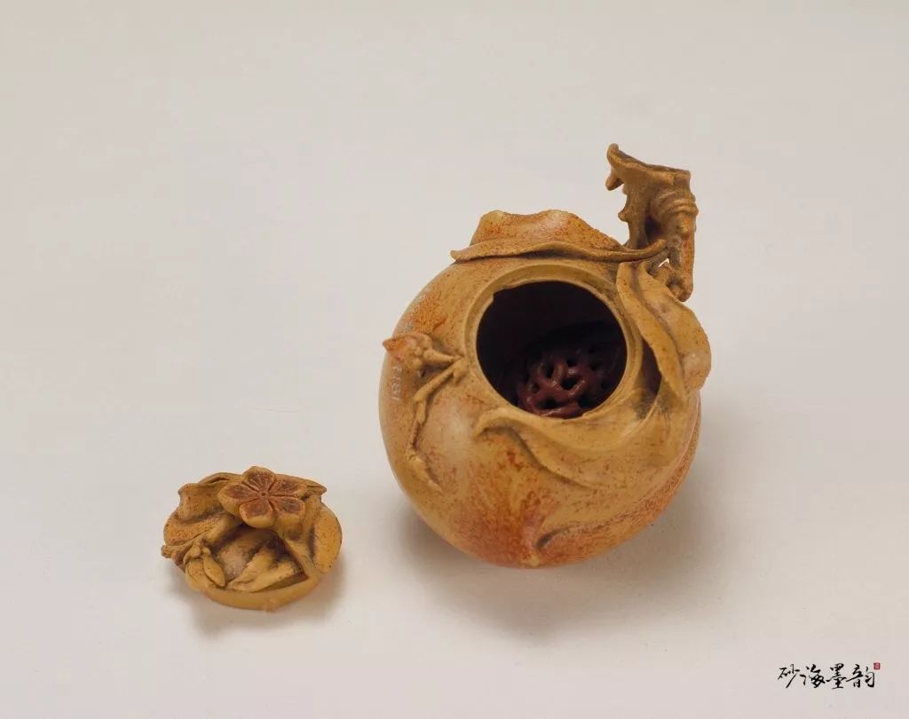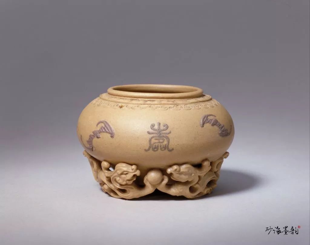 此尊砂泥极细,装饰华丽,是乾隆朝宫廷御用文房清供之一。