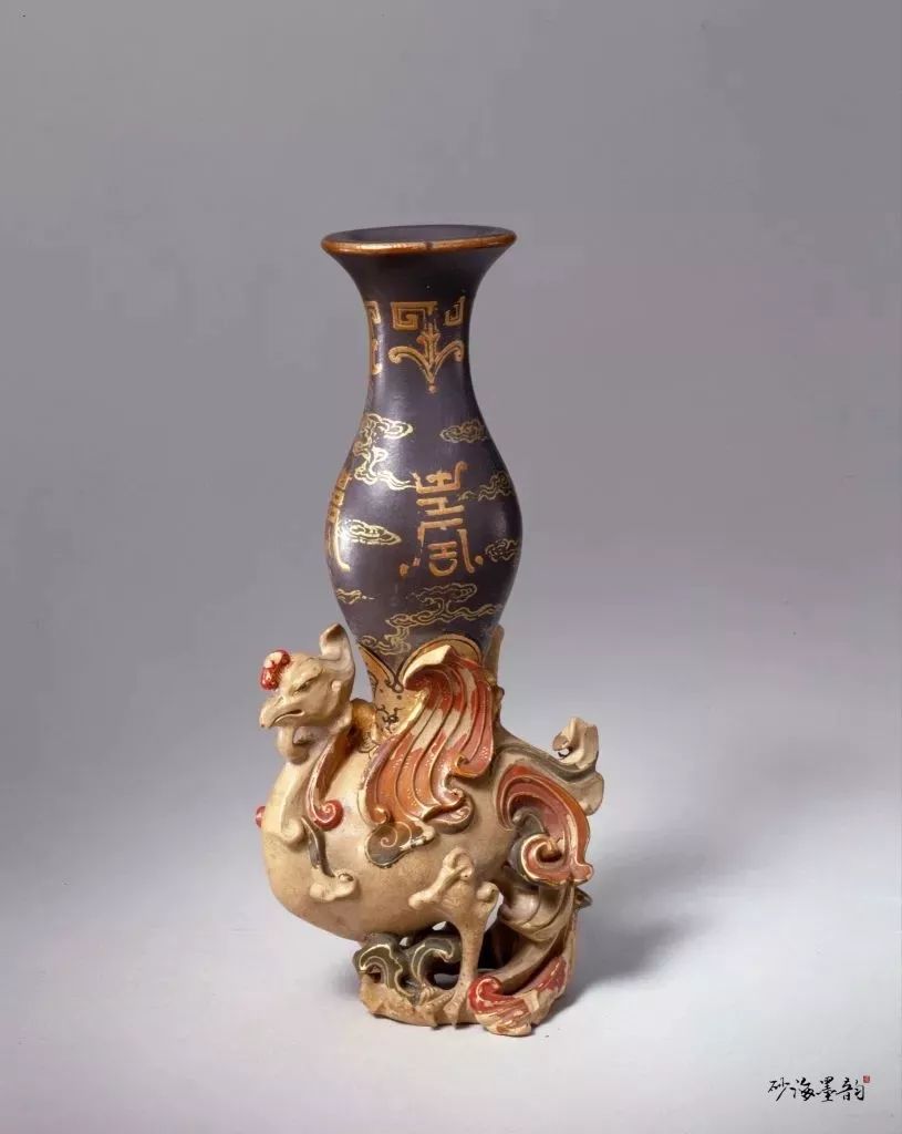 尊作天鸡驮宝瓶式,天鸡腹中空,与宝瓶的底部相通,鸡首口部有出气孔。通体以白、绿两色砂泥制成,以金彩描绘花纹。