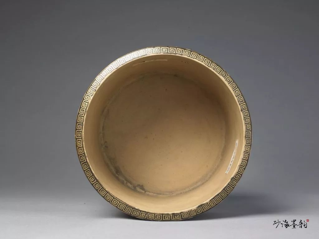 口沿髹黑漆描金彩回纹边饰,底髹黑漆。附描金红漆座,云头形三足。外壁描金堆绘打枣图。紫砂胎上的髹漆描金装饰在清雍正时期做得最好。