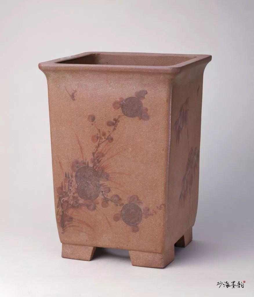 宜兴窑紫砂泥绘花卉方花盆,清,高29.2cm,口径22×22cm ,足径16.5×16.5cm。