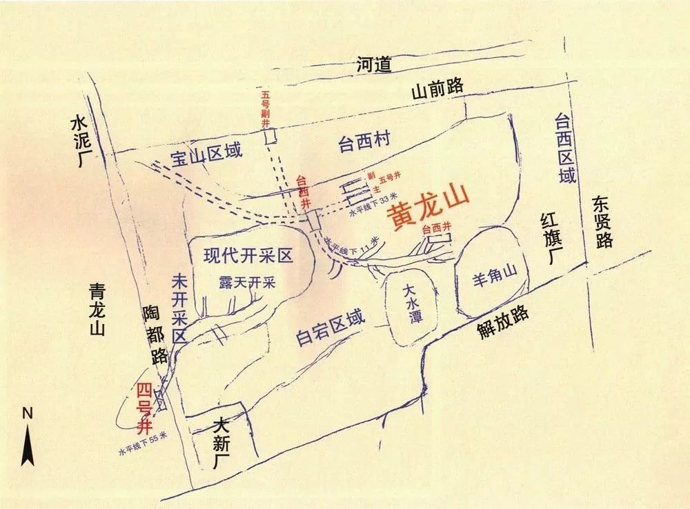 大名鼎鼎的四号井,是唯一不在黄龙山主体部分的矿井,1972年在黄龙山西侧新建四号矿井,主井标高24米,副井标高11米,副井向东与主井相隔约200米。