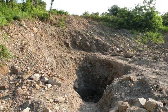 后来因挖通地下水脉而被淹没,形成了一个水潭。现在大水潭周围还掩埋着一些早期采掘留下的暗宕。
