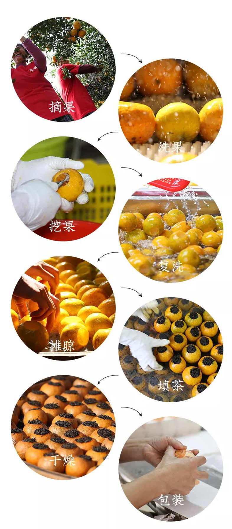 一颗颗饱满圆润的大红柑,需经过洗果、剥肉、填茶、干燥等十几道工序,历经几天几夜后才能成为一颗茶香独特的柑普茶。