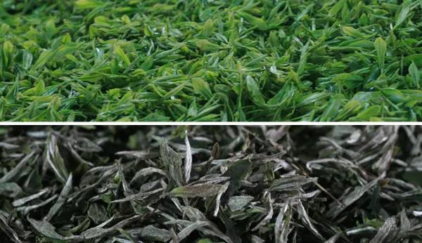 萎凋时,叶片失水,叶态发生变化;叶绿素在叶绿素酶的作用下水解,使叶绿素a、b的比例、细胞液酸度发生变化,叶绿素转化成衍生物,使叶色转暗绿;干燥时叶绿素继续遭到破坏。胡萝卜素、叶黄素的变化及茶多酚氧化物的形成,协调构成了白茶的特殊颜色。