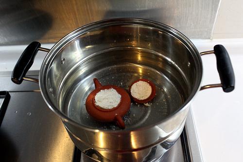 将壶从清水煮过的锅里捞出来后,待壶体及茶配件自然冷却至常温之后,将豆腐放进茶壶内(建议用老豆腐因为吸附性强),填装时稍微压紧,避免豆腐在水煮沸之后跑出壶体。填装完毕后,放入冷水内,加热至沸腾,大概煮1小时直至厨房内充满豆腐香气后即可。