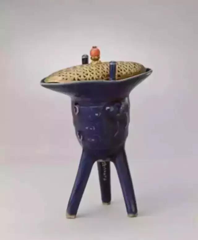 仿青铜器造型,口沿外撇,圆腹略深,前尖后翘,下承三高足,口沿两侧有对称的立柱。明、清两代均有烧造,有青花、白釉、蓝釉及粉彩等品种。