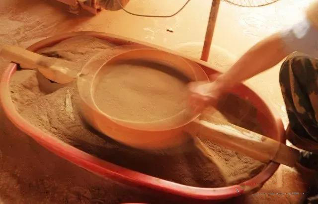 研磨,把筛选出来的矿料,放进石磨中磨粉,这是手工古法的做法,要么用石磨磨,要么就是用的硬物捣,磨出来的粉末,再过筛,拿一个筛网,反复过筛,筛网有目数这一说,目数越大,筛选出来的粉末越细,目数越小,粉末越粗,一般手工研磨的,泥料都相对粗一些,但透气性是比机器研磨的会好很多。